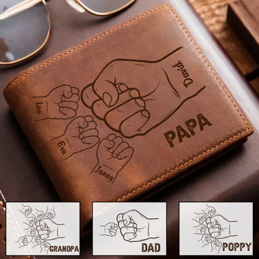 Heb je ooit het gevoel dat je de speciale band met je kind vergeet in de dagelijkse drukte? De Clenched Hands Leather Wallet is er om je elke dag te herinneren aan die dierbare momenten. Deze gepersonaliseerde portemonnee is gemaakt van echt eersteklas leer en heeft een symbolisch ontwerp van de handen van een vader en een kind die ineengeklemd zitten, als dagelijkse herinnering aan liefde en verbondenheid. Houd je spullen georganiseerd terwijl je een stukje van je hart met je meedraagt.